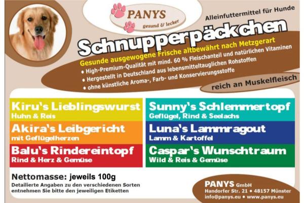 welche der 6 Geschmacksrichtungen mag er am liebsten oder findet er alle Sorten gleich lecker? Der ideale Geschmackstest für alle Hunde und besonders für Hunde die eine Glutenunverträglichkeit haben. Alle PANYS Würste sind für ausgewachsenen Hunde als Alleinnahrung geeignet. Auch Welpen ab dem 3. Lebensmonat dürfen schon die PANYS Wurst bekommen. Allerdings haben Welpen einen höheren Bedarf an Kohlenhydraten, daher sollten Sie bitte Welpen-Trockennahrung zufüttern.Hier erhalten Sie ausschließlich High-Premium-Qualität mit mehr als 60,0 % Fleischanteil, reich an Muskelfleisch und alle als getreidefreie Rezepturen.Hergestellt in Deutschland nach Lebensmittelstandard, ohne zugesetzte künstliche Aroma- und Farbstoffe